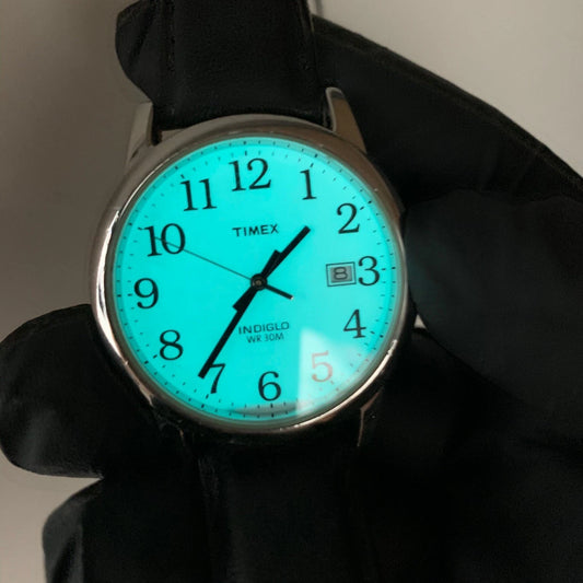 Timex Indiglo WR30M Men's Watch Day Date Silver w/ Black Leather Strap