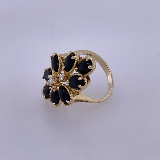 14k Yellow Gold Ladies Flower Ring W/ Diamond & Black Colored Stones